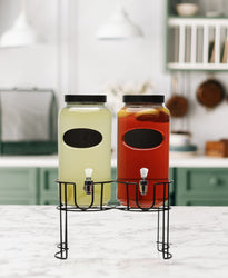 DUMONT SET OF 2 DISPENSERS W/CHALKBOARD, CHALK, BLACK LID & BLACK METAL STAND 118oz each, in remailer