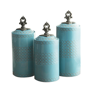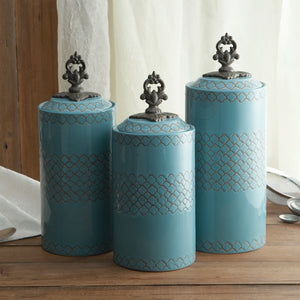 - Set includes 3 blue stoneware canisters in varying sizes.