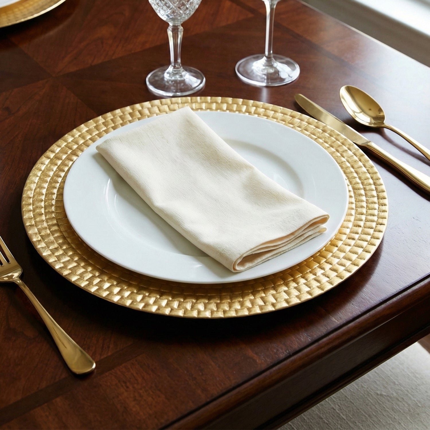 Elevate your table with our “Chargers” collection — a carefully selected mix of decorative charger plates that bring polish and presence to every setting. From electro-plated metallics and rich embossing to sleek mirrored finishes and classic glass with subtle detailing, these chargers are designed to anchor your place settings with a layer of elegance. Ideal for everyday sophistication or special-occasion flair, each piece brings refined texture and style to the table.