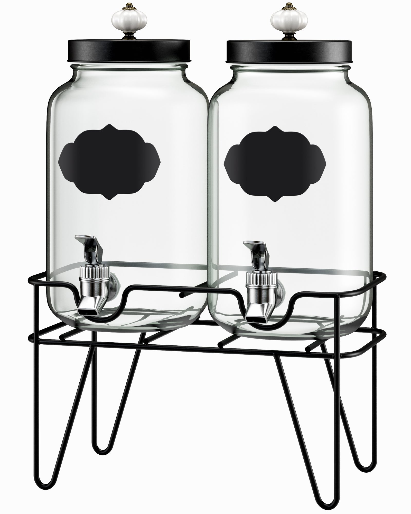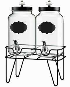 What's Included: Set of 2/ 3.1 L Each Dispenser, Wire Stand, Lids with Ceramic Knobs, Spigots, Chalk