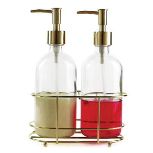 Dispense It Duo 2-Piece Set of 2 Soap Pumps with Gold Color Metal Caddy
