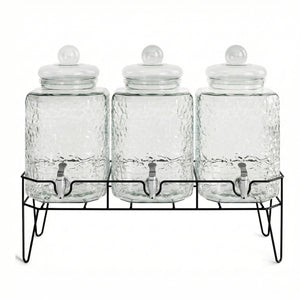 The Hamburg Triple Dispenser Set delivers professional-grade beverage service with three 1.5-gallon each capacity dispensers mounted on a unified stand.
