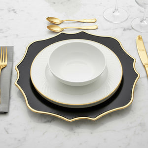 Elevate your table setting with this sophisticated set of four charger plates, each measuring 13 inches in diameter. The scalloped rim design combines black and gold accents with a pristine white center, creating a striking contrast that complements both classic and contemporary table décor. These chargers provide an elegant foundation for place settings, adding depth and visual interest while protecting your tablecloth. Ideal for formal dinners, special occasions, or everyday entertaining, this set brings refined style to any gathering.